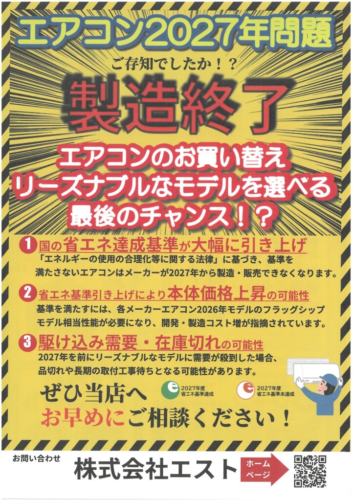 2027年より省エネ基準達成率が100%に満たないエアコンが製造終了になります💡